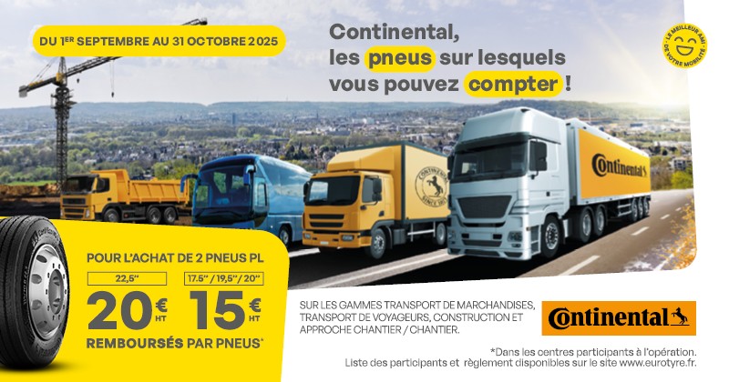 Du 1er septembre au 31 octobre 2025, pour l’achat de 2 pneus poids lourds Continental, profitez de 20€ HT remboursés par pneus pour la dimension 22,5″ et 15€ HT remboursés par pneus pour les dimensions 17,5″/19,5″/20″ sur les gammes transport de marchandises, transport de voyageurs, construction et petits poids lourds.